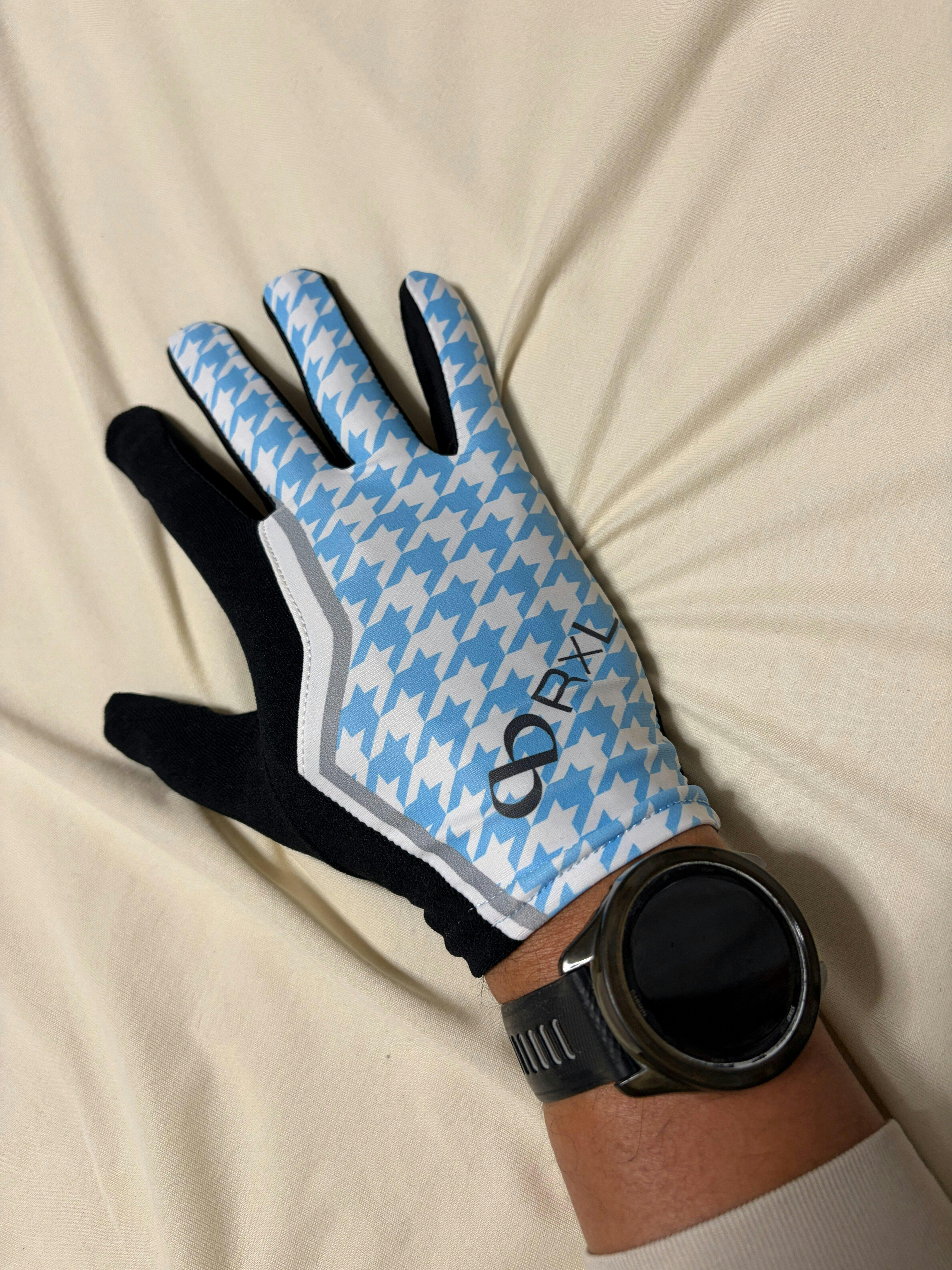 これまでのサイズを見直し、手にフィットする形状に変更。人差し指と掌がパイルで汗が拭きやすい!指先はスマホにも対応。